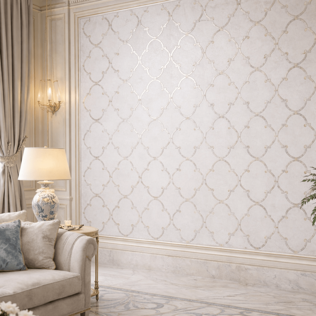 A refined marble inlay wall panel featuring a delicate arabesque pattern in soft neutral tones, crafted to create an elegant backdrop that enhances luxury interiors with timeless architectural grace.