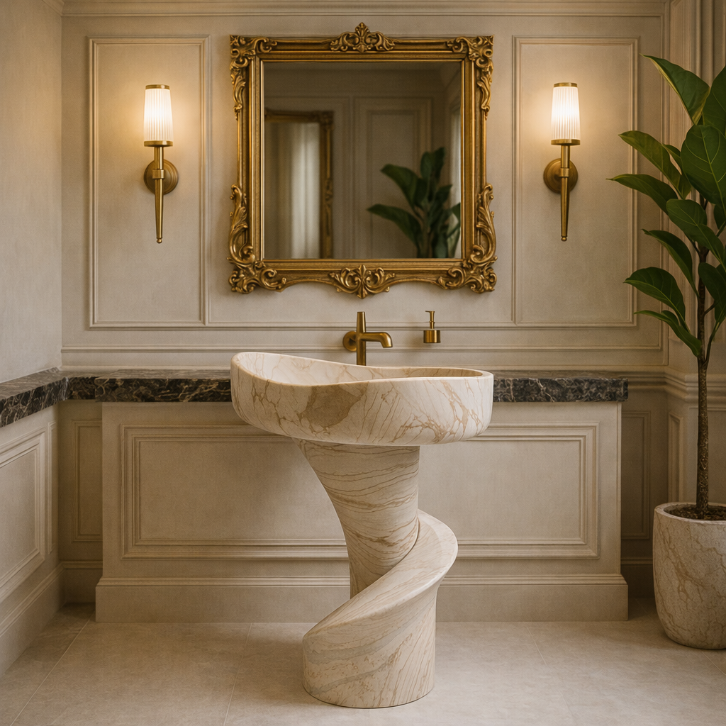 An artistic spiral pedestal washbasin carved from light-toned natural stone, featuring soft flowing veins and a sculptural form. Paired with antique gold accents and classic detailing, it creates a refined statement piece for luxury and designer bathroom spaces.