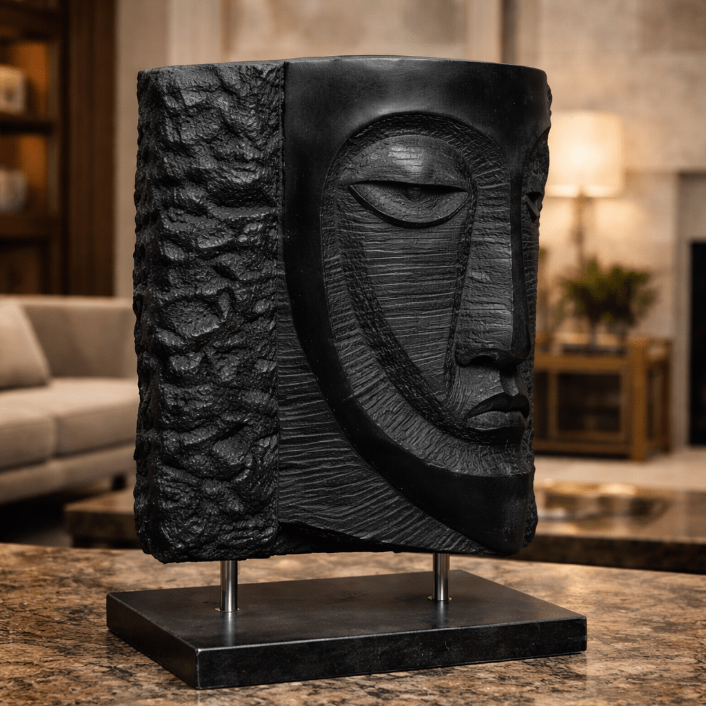 A striking fusion of raw texture and refined form, the Eclipse Face Monolith captures quiet strength and modern elegance. Sculpted from deep black stone, its contrasting surfaces—rugged on one side, finely contoured on the other—create a powerful visual dialogue between nature and design. Mounted on a minimalist metal base, this statement piece adds depth, character, and artistic sophistication to luxury interiors, offices, or curated spaces.