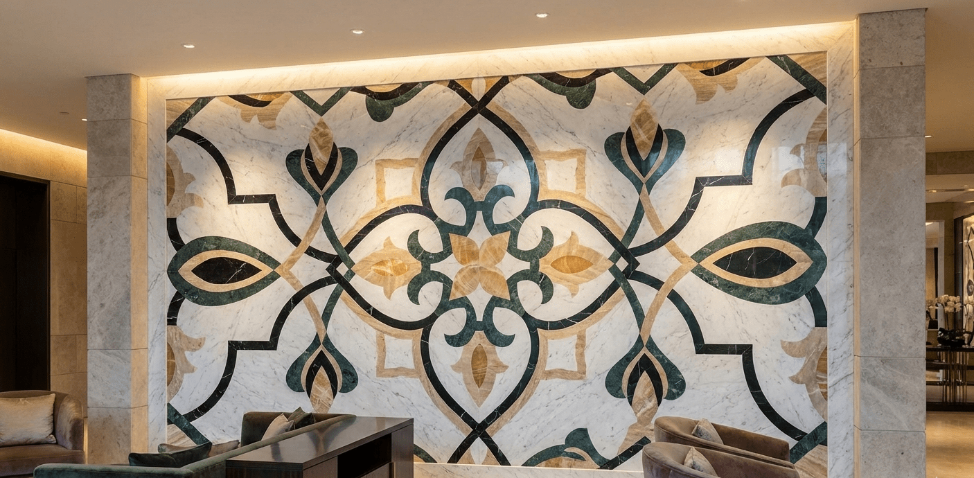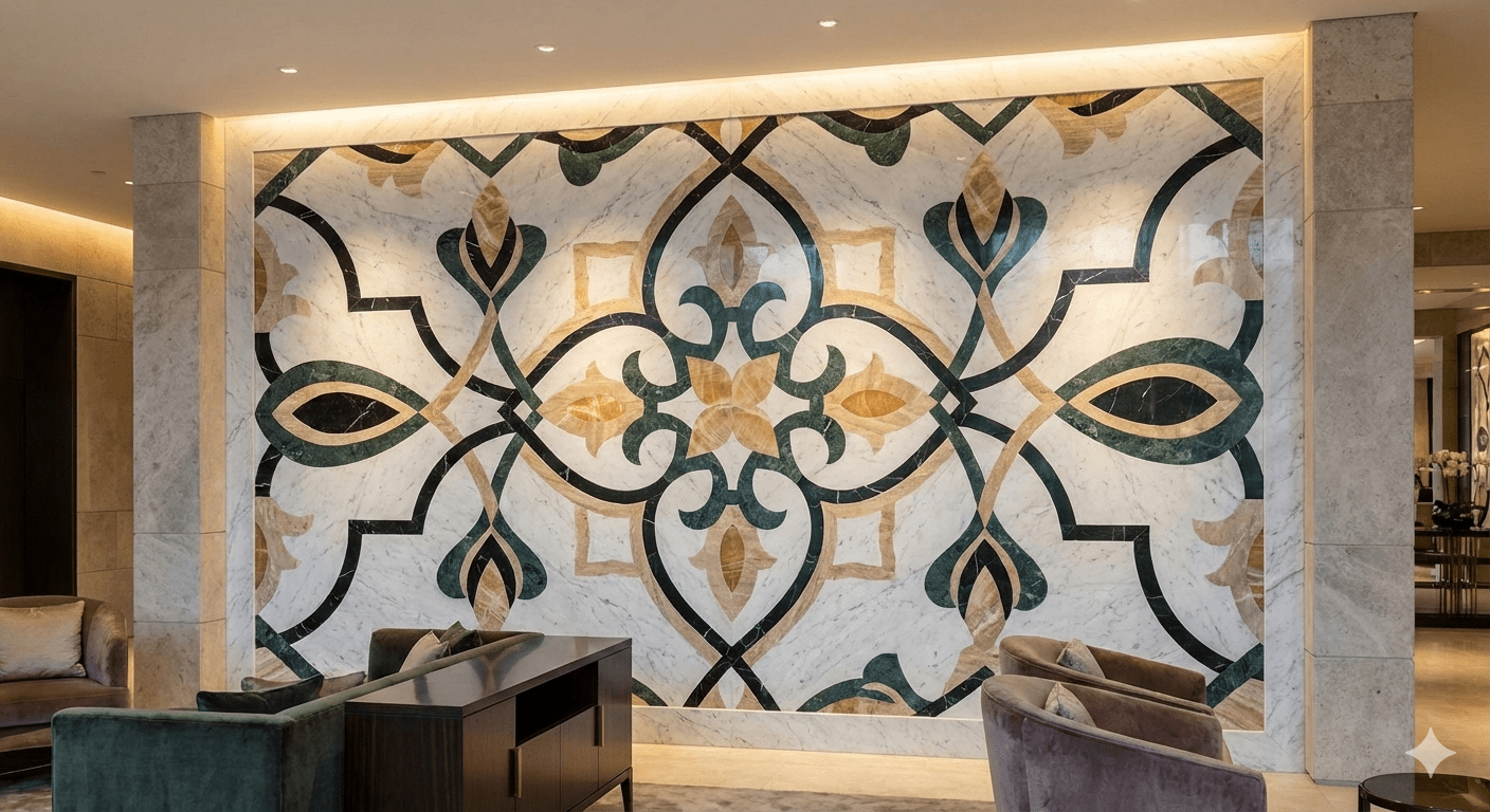 An elegant marble wall inlay panel featuring a symmetrical floral and geometric pattern crafted from natural stone accents. Set on a white marble base with rich green, black, and warm beige tones, this statement wall adds refined luxury and artistic depth to premium interiors such as living rooms, lobbies, and feature walls.