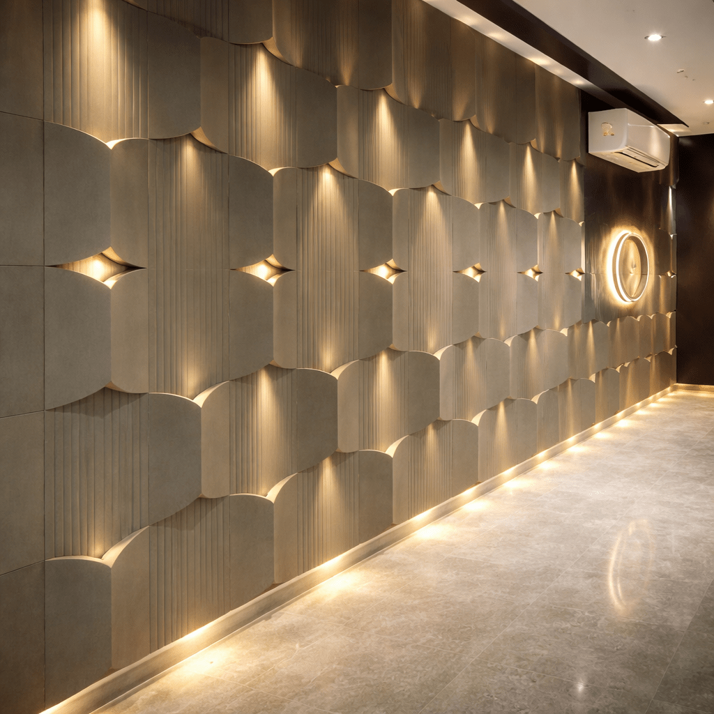 A contemporary feature wall crafted with sculpted stone panels in a rhythmic geometric pattern. Integrated warm backlighting highlights the carved textures and soft curves, creating depth, movement, and a refined luxury ambiance ideal for modern living spaces, offices, and hospitality interiors.