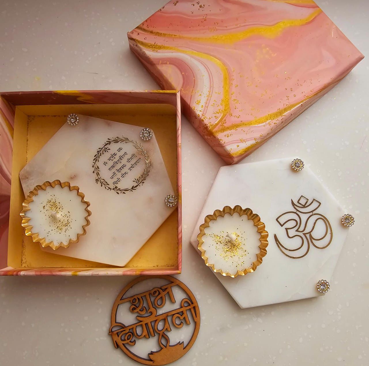 Marble hexagon metal votive candles platters for gifting this season