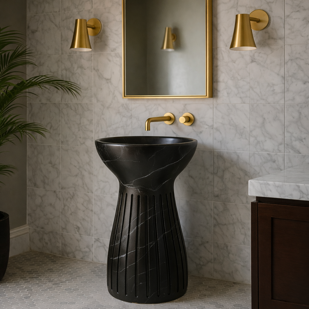 A statement pedestal washbasin carved from natural black stone, featuring a fluted base and smooth bowl top, paired with warm brass fixtures and marble wall cladding for a bold, contemporary luxury bathroom setting.