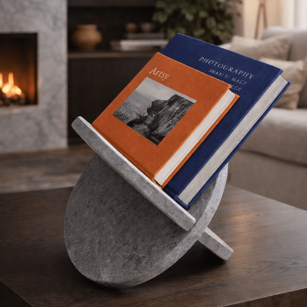 A contemporary stone book stand designed to elegantly display your favorite books. Its sculptural form and solid construction add a stylish, modern touch to coffee tables, shelves, or desks while keeping books securely in place.