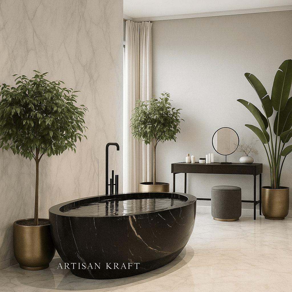A sculptural freestanding bathtub carved from deep black marble, highlighted with natural golden veining. Its smooth, organic form brings a sense of calm luxury, turning the bathing space into a refined spa-like retreat.
