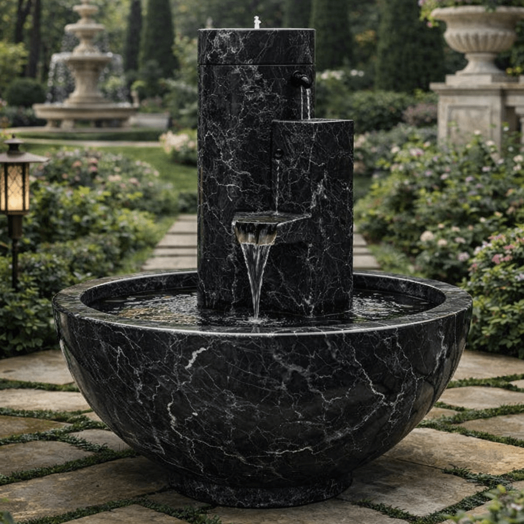 The Noir Cascade Marble Fountain is a striking contemporary water feature crafted from premium black marble with natural white veining. Its modern geometric design and smooth cascading water flow create a bold yet calming statement, making it perfect for luxury gardens, courtyards, and sophisticated landscape settings.