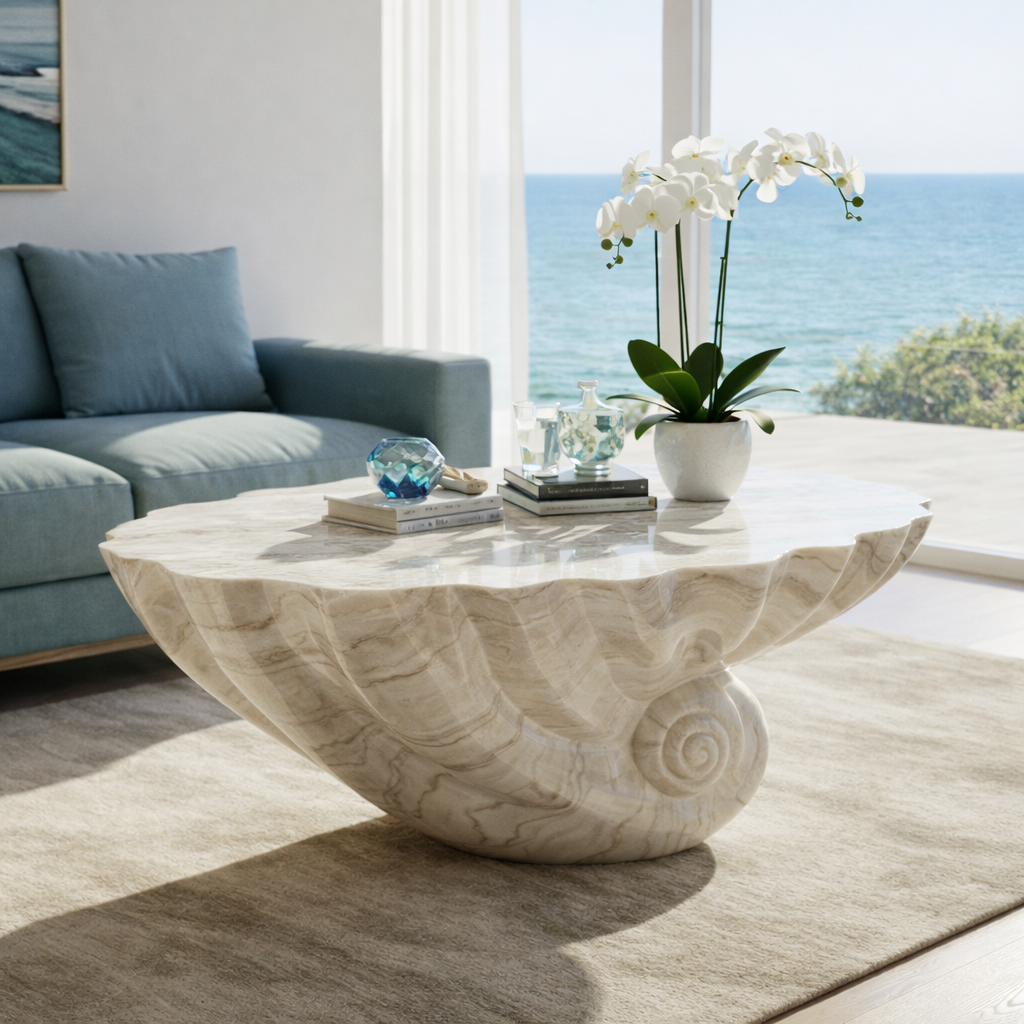 An elegant sculptural coffee table inspired by natural seashell forms, crafted to bring a sense of coastal luxury and organic beauty into modern living spaces. Its flowing curves and soft veining make it a striking centerpiece for refined interiors.