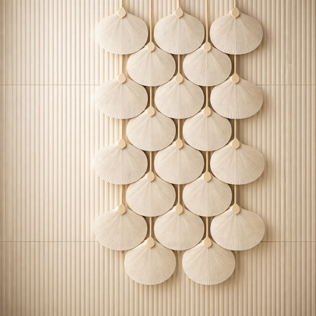 An elegant stone wall panel featuring layered fan-shaped reliefs with fine radial carving and soft vertical accents. The sculptural composition creates depth, movement, and a play of light and shadow, making it ideal for luxury interiors, feature walls, and high-end architectural spaces.