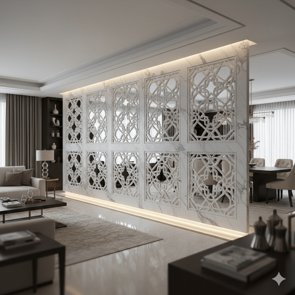 A sophisticated white marble jali partition featuring finely detailed geometric patterns set within framed panels. Crafted from premium natural marble and enhanced with subtle backlighting, this elegant partition creates a perfect balance of privacy and openness, making it ideal for luxury living rooms, dining areas, and high-end residential or hospitality interiors.