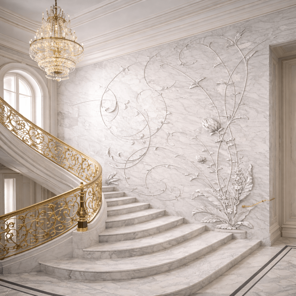 A premium white marble wall panel featuring elegant floral vine detailing, designed to enhance luxury staircases and grand interiors with timeless sophistication and refined architectural beauty.