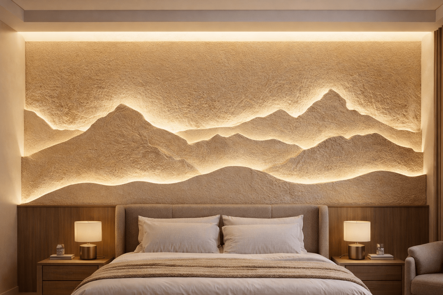 The Sandstone Horizon Glow Wall Mural is a masterpiece that transforms your bedroom into a serene retreat. Featuring layered mountain contours carved in premium sandstone and enhanced with warm backlit LED illumination, this mural creates depth, texture, and a soft ambient glow. Perfect for luxury interiors, it blends natural stone artistry with modern lighting to deliver a calming and sophisticated statement wall.