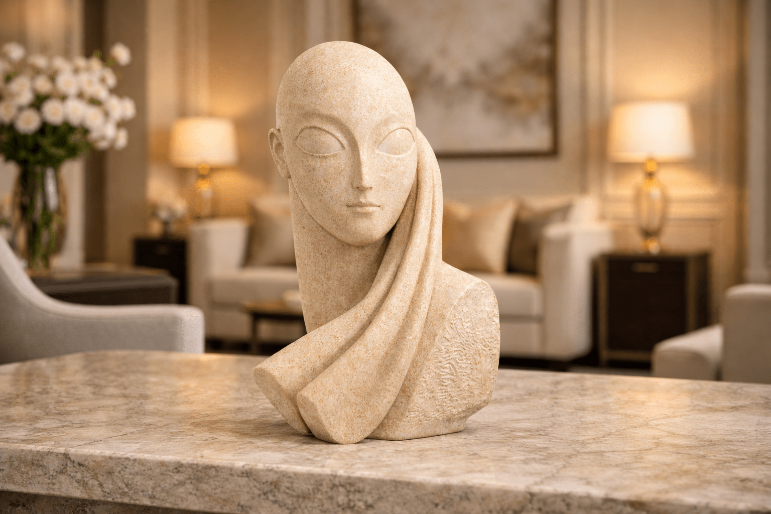 A refined stone sculpture that captures quiet elegance and timeless beauty. With its soft contours and flowing drape, Serene Muse brings a sense of calm and sophistication to any interior, perfect as a statement piece for consoles, coffee tables, or curated shelves in modern luxury spaces.