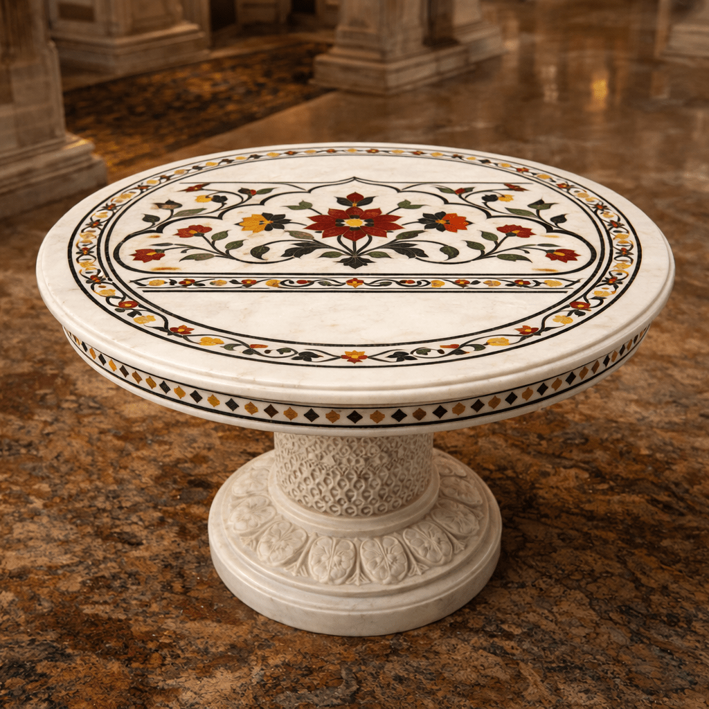 An elegant round pedestal table made from premium white marble, featuring refined floral inlay detailing with natural stone accents. The polished tabletop and sculpted pedestal base create a balanced blend of classic design and luxury, making it ideal for sophisticated interiors and statement spaces.