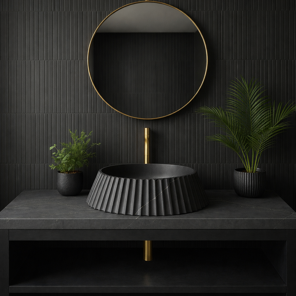 A bold, contemporary bathroom vanity featuring a sculpted fluted stone basin in deep charcoal tones, paired with a matte black surface, brushed brass fixtures, and a round framed mirror for a dramatic, modern luxury look.