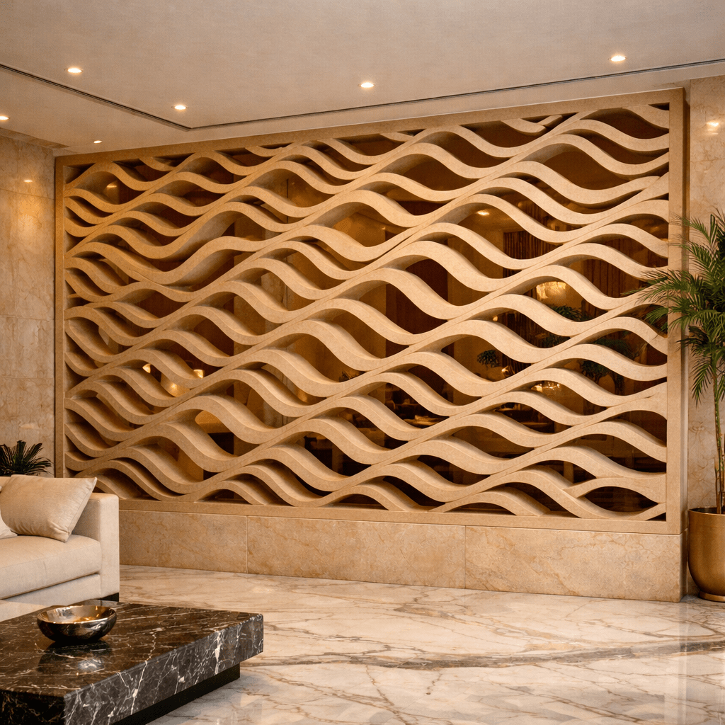 A luxurious CNC-cut marble jali partition featuring a flowing wave pattern, crafted from premium natural stone. This elegant partition adds depth, privacy, and artistic sophistication to modern living spaces, perfectly blending functionality with timeless design.