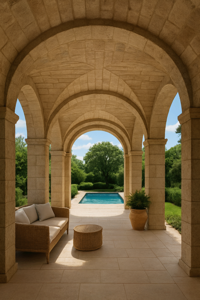 Inspired by classical architecture, vaulted or domed stone roofs lend a royal touch to outdoor lounges and garden pavilions. The curvature of the roof not only enhances aesthetics but also allows natural ventilation.