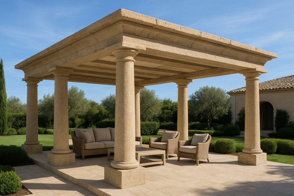 This design embodies strength and simplicity. Large stone columns support horizontal stone slabs that form the roof, casting soft shadows and giving a cool refuge even in summer heat. Perfect for villas and courtyards, it carries the rustic grace of old Mediterranean estates.